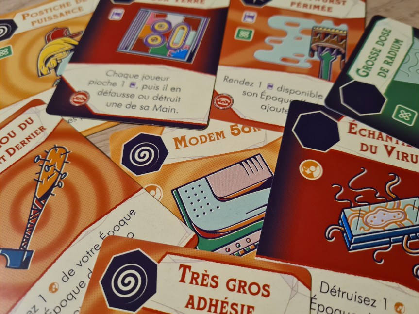 Même si l’univers peut paraître chargé, avec ses couleurs et ces lignes très fortes, il est en fait étonnamment clair car l’iconographie est simple et intuitive. Les failles renvoient aux cubes rouges et l’énergie aux cubes verts, l’icône clones se reconnaît à sa ressemblance avec Foo et les époques ont leur propre sigle représenté sur chaque carte qui vient s’ajouter à la couleur spécifique qui leur est attribuée. C’est une bonne idée pour les daltoniens et pour cela compense ce qui est pour moi un défaut des cartes trous noirs : le cadre de celle-ci comporte une aura noire qui vient modifier la couleur habituelle liée à l’époque et la distinction entre la « mondialisation » et la « fin de temps » est moins évidente. En outre, l’icône de l’époque apparaît au dos des jetons clones pour savoir où les placer, ce qui évite une confusion avec le recto représentant un clone qui indique l’époque où le détruire.