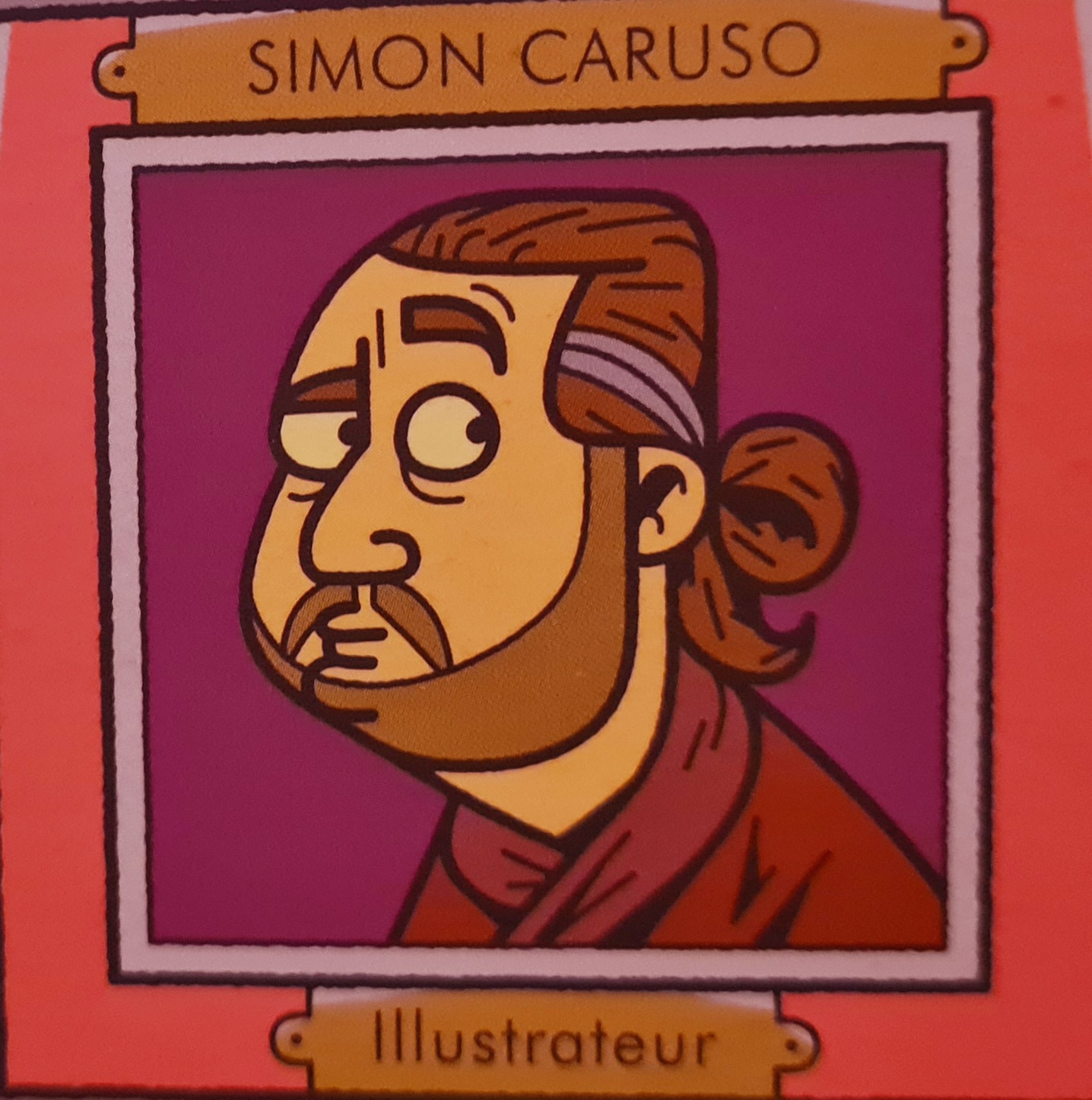 En regardant de plus près le matériel de The Loop, on ne peut être qu’impressionné par la cohérence graphique de l’ensemble, présente jusque dans les détails. Simon Caruso a donné une unité au jeu dans le style adopté. On pourrait penser que celle-ci passe uniquement dans le trait du dessin mais l’illustrateur réussit le pari de synthétiser tout l’univers de The Loop en trois symboles qui se retrouvent partout sur le matériel : le sablier, le cercle et la brisure. L’ensemble fait sens quand on connaît l’histoire de The Loop. Le temps forme une boucle (qui est la traduction du mot « loop » en anglais), menacée par un savant fou qui créé des failles et détruit l’équilibre de l’Espace-Temps. Le personnage de Foo incarne ces trois idées par son design : la tête du personnage forme un sablier et son monocle représente la boucle. Celle-ci est fendue en son milieu, pour évoquer le détraquement du temps. La boucle est omniprésente dans le jeu, illustrant parfaitement son titre dont le nom en anglais permet de garder le double « O » que l’on retrouvera aussi dans « Foo », écrit ainsi pour jouer sur l’homophonie avec l’adjectif auquel on s’attendrait. Elle entoure les icônes des époques et se retrouvent aux entrées de celles-ci depuis la machine. Elle vient cercler le visage du docteur Foo sur le sac de clones, eux-mêmes présentés sous cette forme circulaire. La boucle se retrouve sous forme de petits détails sur chaque personnage et j’ai notamment adoré les lunettes de Mister Time, chef d’équipe, qui le présentent comme un anti-Foo par la même brisure qu’on retrouve dans leurs verres. Le sablier, lui, est visible dans la silhouette du docteur Foo de l’icône Clones, dans la forme des jetons Sayan Supa Clones, ou au dos des cartes Foo. Enfin, la brisure est partout, sur le plateau central à l’intérieur de la machine, sur l’icône failles, mais aussi au dos des cartes où l’assemblage des couleurs dans le verre brisé illustre le mélange des époques. C’est harmonieux et je trouve que cela va vraiment bien avec le style graphique du jeu et des personnages, très géométriques, comme si le voyage dans le temps déformait les êtres.