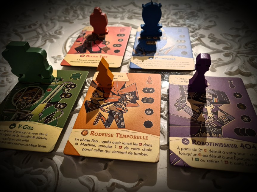 Enfin, soulignons le design des personnages, là encore très tranché. Les pions représentent leur silhouette et je trouve qu’ils reflètent la stylisation du jeu – coup de cœur pour Robofinisseur 404 qui me rappelle une reine de jeu d’échecs. J’ajouterais que les personnages font la part belle aux femmes puisque trois sur cinq sont plutôt féminins – je dis « plutôt » parce qu’on peut aussi penser que le jeu botte astucieusement en touche sur les problématiques de genre avec un « robot » et un « moyen ancien », à l’identité plus incertaine.