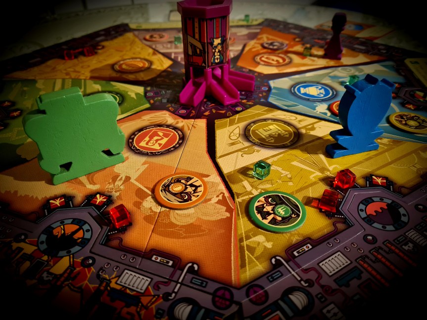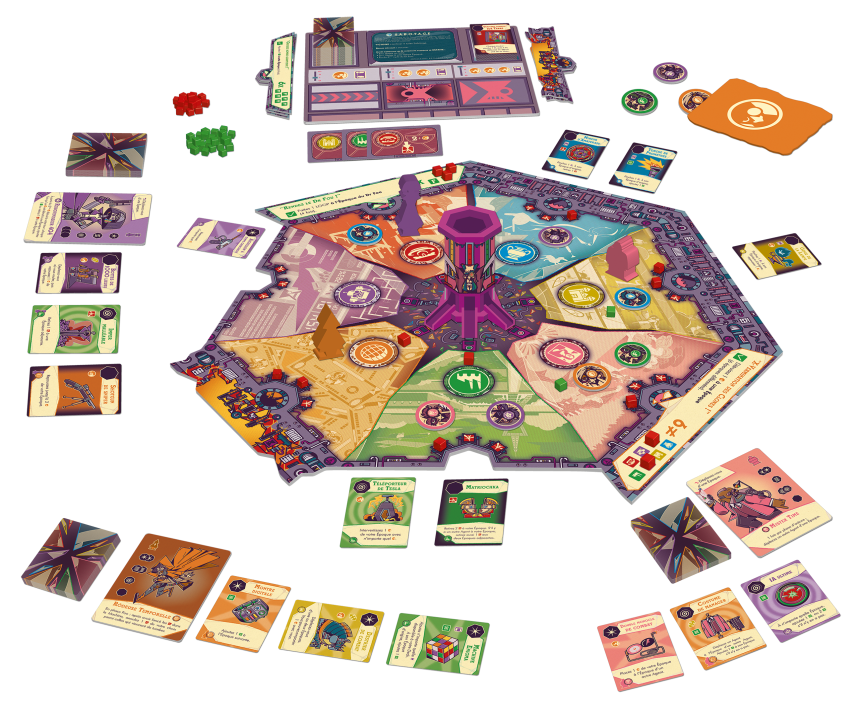 The Loop vous propose un matériel complet de bonne qualité : les figurines joueurs en bois, peintes, sont de belle taille et agréables à manipuler, les cartes sont rigides et résisteront sans mal à de nombreux mélanges et les nombreuses tuiles en carton sont bien épaisses, de même que les plateaux fournis. J’avais été impressionnée par la qualité du matériel dans Pharaon, le précédent jeu de CatchUpGames, mais ils sont allés plus loin avec la machine du docteur Foo, superbement imprimée en 3D. En plus de remplir sa fonction de distributeur de cubes aléatoire, il s’intègre parfaitement au plateau central.