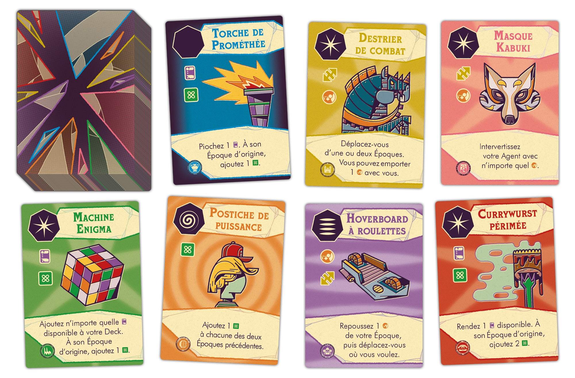 Les personnages sont par ailleurs associés à un deck de cartes de départ qui permet de les découvrir davantage : en effet, les cartes viennent confirmer une mécanique suggérée par leur pouvoir mais décrivent aussi davantage l’agent puisque chacune d’elle renvoie à un élément de sa panoplie (vous trouverez ainsi les lunettes de Mister Time, les bottes de Robofinisseur ou encore la cape de la rôdeuse). On aime les petits détails dans l’illustration qui participent à la thématisation : utiliser le déplacement gratuit d’un personnage vous fait retourner sa tuile et le personnage est alors visible de plus loin, montrant ainsi le mouvement qui vient d’avoir lieu.