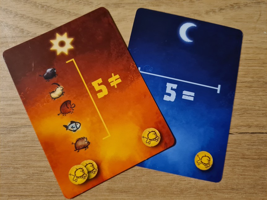 Par ailleurs, l’ajout des objectifs uniques sur cartes booste la rejouabilité car le tirage orientera vos stratégies et évoluera à chaque partie. Vous pouvez évidemment construire votre jeu sur les objectifs plateau qui sont permanents mais la valorisation des objectifs cartes, pour le premier qui les remplit, vous poussera à les prendre en compte. Or, ces cartes missions sont double face et cela participe au renouvellement du jeu mais aussi à l’ouverture de Prehistories à un public plus large : la face jour, qui est recommandée pour commencer, est plus familiale car les objectifs sont simples et plus rapides à atteindre ; la face nuit réhausse un peu le challenge et certaines cartes exacerbent la crispation parce qu’elles ont un enjeu de trois jetons totems au lieu de deux. Les ignorer devient très dangereux : la course ou le blocage s’intensifient pour celles-ci. De quoi vous donner envie de multiplier les parties pour relever les différents défis des Anciens !