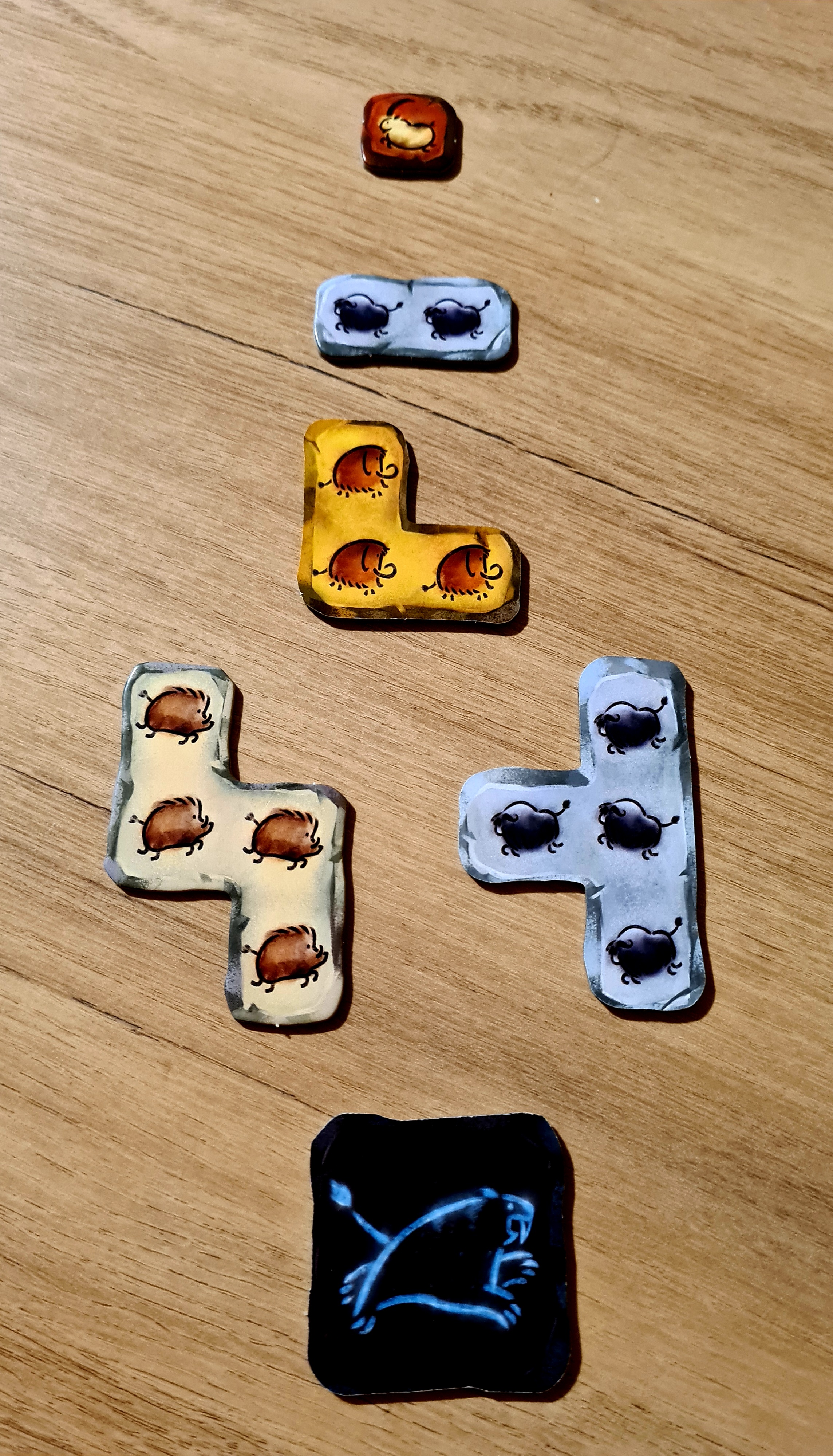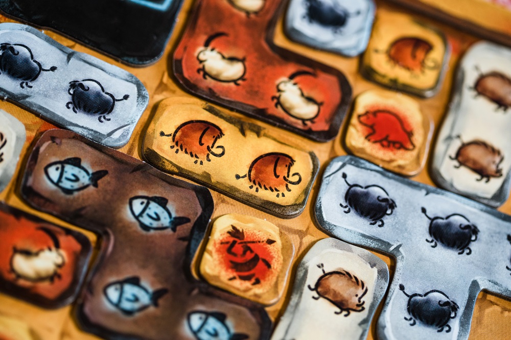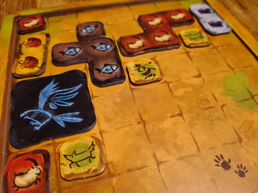 En pratique, le jeu est très simple : quand c’est votre tour de jouer, selon l’initiative, vous pouvez envoyer vos chasseurs sur une ou plusieurs zones pour décider quels animaux abattre – ah, c’est beaucoup moins mignon d’un coup ! – puis placer les polyominos obtenus dans votre grotte. Mais vous devrez quand même vous creuser la tête pour ne pas gâcher l’une de vos opportunités : si vous pouvez chasser l’animal recherché, tout va bien, mais si celui-ci a été pris par l’un de vos adversaires, vous rabattre sur d’autres options devra être bien considéré car il serait peut-être préférable de garder vos chasseurs pour une autre expédition. Le placement n’a en outre rien d’évident parce que contrairement à la plupart des jeux de polyominos où vous pouvez tourner votre pièce dans tous les sens, dans Prehistories, les possibilités sont limitées par la nécessité de représenter votre animal dans le bon sens (on n’a jamais vu un buffle les pattes en l’air) et le polyomino désiré, avec la bonne bête et le bon nombre de cases, deviendra parfois inexploitable car la configuration n’est pas celle dont vous avez besoin.