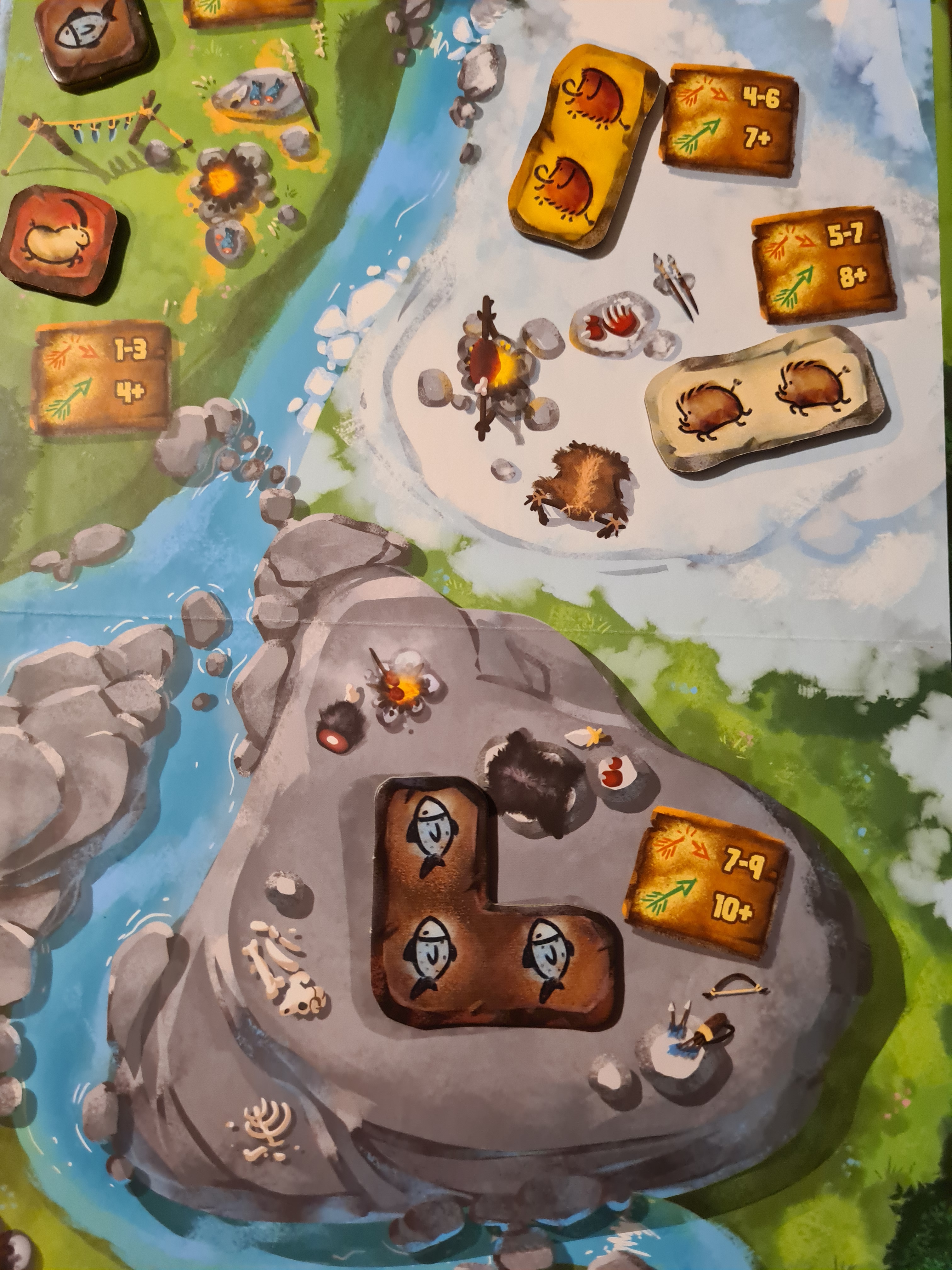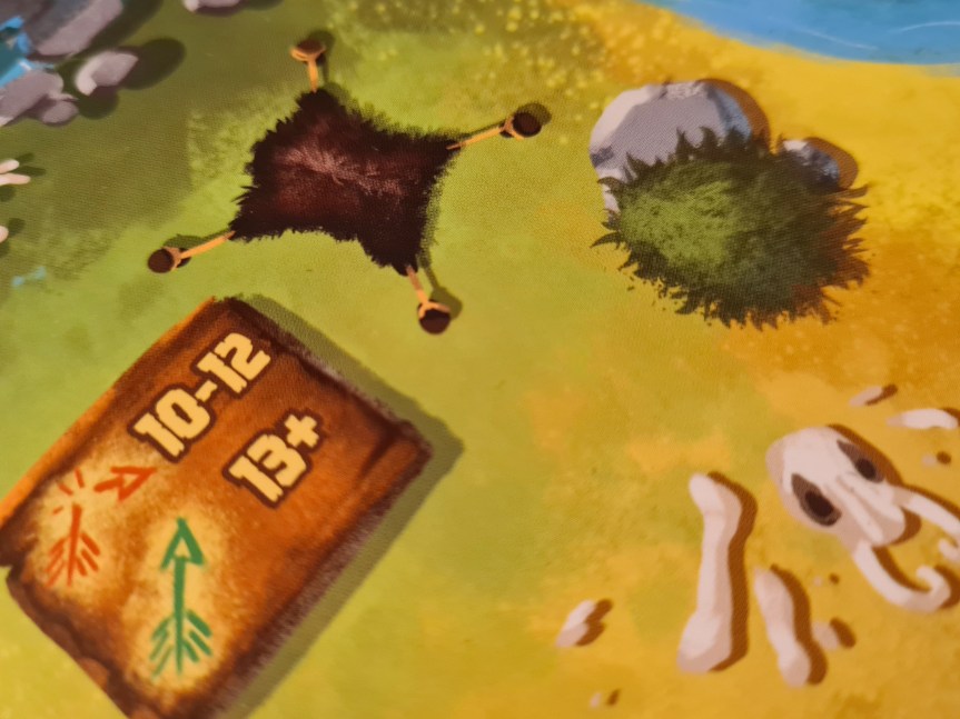 Par ailleurs, on peut profiter de ces illustrations car elles ne sont pas éclipsées par l’iconographie nécessaire à la mécanique du jeu. Cette dernière reste discrète, tout d’abord parce que les dessins d’animaux y participent directement, pour identifier les joueurs ou pour répondre à certains objectifs. Elle se limite ensuite à quelques symboles faciles à comprendre comme une flèche verte intacte qui symbolise une chasse réussie, alors que la flèche rouge brisée montre une chasse réussie mais qui ne s’est pas terminée sans dommage puisqu’un chasseur a été blessé. Une petite partie en haut du plateau affiche les objectifs permanents et, comme c’est d’ailleurs aussi le cas pour les objectifs uniques apparaissant sur les cartes, ils se comprennent parfaitement car cela passe par un petit schéma du plateau grotte. On apprécie cette iconographie limpide et peu envahissante.