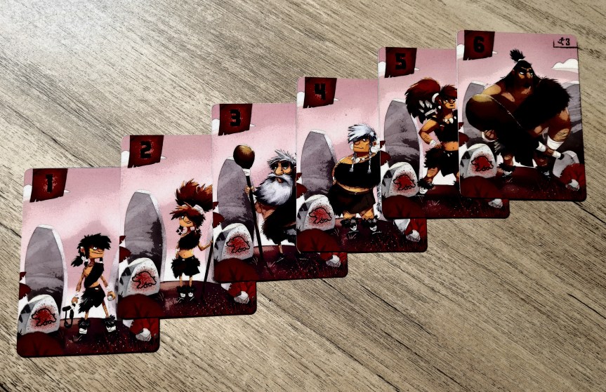 Ce que j’aime aussi avec la course de Prehistories, c’est qu’elle est juste. Sur un jeu rapide, on pourrait s’attendre à ce que celui qui prend l’ascendant au début le garde et l’emporte sans qu’on puisse réagir : ce n’est pas le cas car pour la phase d’enchères, on dispose tous du même paquet et le seul hasard est dans l’ordre de sortie des cartes. Un joueur aura peut-être la chance dès le départ de prendre une grosse pièce, un animal légendaire par exemple, avec une main heureuse, mais il lui restera alors les éléments les plus faibles pour les tours suivants. Par ailleurs, pour départager les égalités, chaque chasseur dispose d’une valeur de rapidité inscrite sur sa carte et les auteurs ont veillé à l’équilibre entre les decks pour que les avantages soient partagés équitablement entre les joueurs (par exemple, une des tribus aura pour les chasseurs de poids 1 l’élément le plus rapide d’une part et le plus lent d’autre part, et disposera de valeurs plus intermédiaires pour les chasseurs des autres poids). Il y a aussi une très légère asymétrie au niveau des plateaux qui pourrait donner l’ascendant à un joueur pour tel ou tel objectif mais cette situation est généralement tempérée par les autres objectifs qui seront moins à son avantage.
