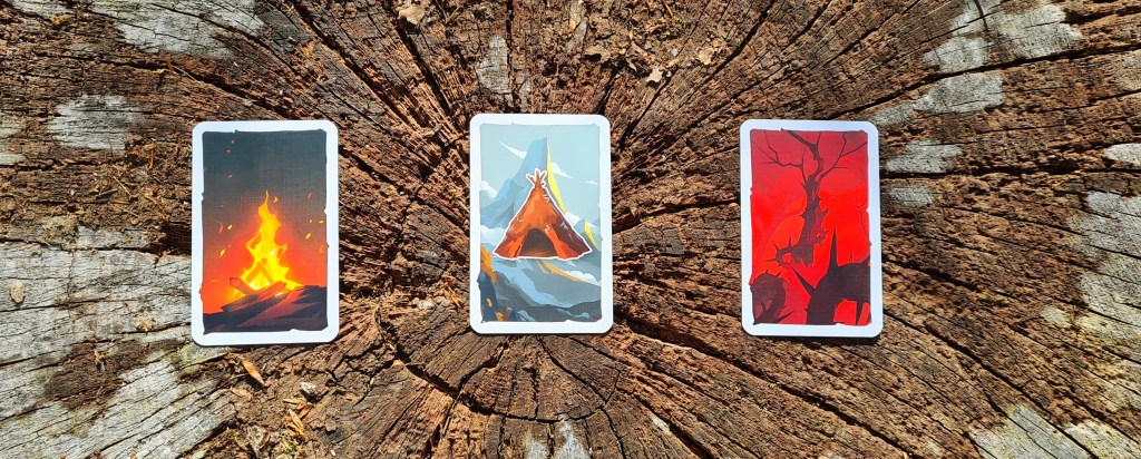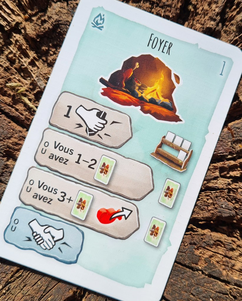 Dans Paleo, vous n’aurez le droit de ne regarder que le verso des cartes dans un premier temps. Chaque joueur doit choisir l’une des trois cartes disponibles devant lui, sur la base d’indices assez faibles. Ainsi, la forêt regorge probablement de bois et de nourriture… mais s’agira-t-il de branches à ramasser et de baies à cueillir, sans risques, ou d’une bête à affronter qui vous demandera une tribu bien armée ? Cette carte danger rouge sur laquelle on aperçoit une caverne obscure vous fait un peu peur et suscite le débat parmi les membres de votre tribu : vous pourriez vous blesser en rencontrant une créature sauvage mais cette grotte renferme aussi peut-être de précieuses ressources. Les cartes foyer, rêve, personnage et idée sont toujours positives mais tout le reste est inconnu. Néanmoins, ce ne sera pas le cas tout au long de la partie et c’est bien là tout le sel de la mécanique qui vous pousse à découvrir les secrets de Paleo pour vous perfectionner.