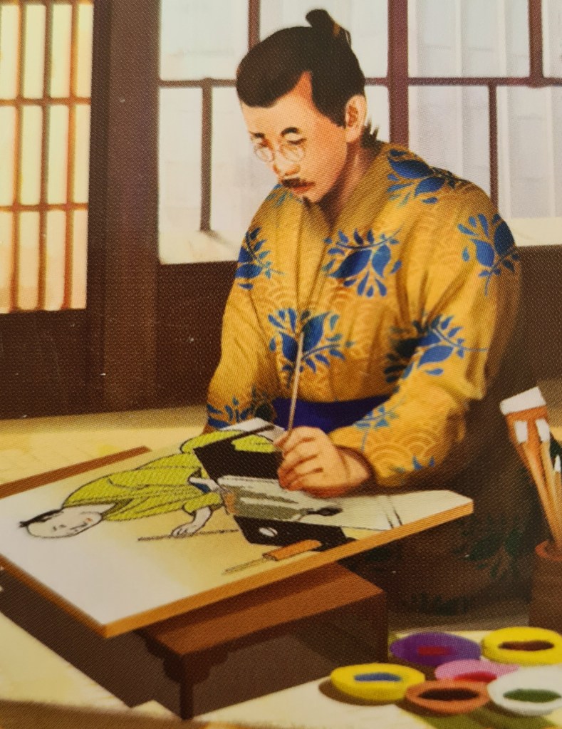 La première chose qui frappe le joueur dans Iki est donc son esthétique, résolument moderne. Des voix s’élèveront sans doute contre ce style, lui reprochant son caractère conventionnel : il faut avouer que la précédente édition d’Iki avait opté pour un choix plus clivant mais aussi plus thématique encore en proposant des estampes inspirées du mouvement de l’ukiyo-e qui s’est développé à l’époque Edo. Néanmoins, je trouve les illustrations de David Sitbon très réussies et on peut d’ailleurs noter un clin d’œil à l’ancienne édition et à l’histoire artistique japonaise puisqu’une carte représente justement un artiste ukiyo-e dans une jolie mise en abîme puisqu’il est en train de peindre l’ancienne carte le représentant ! D’autre part, le mont Fuji qui apparaissait sur l’illustration du premier Iki est maintenant dessiné à l’intérieur du couvercle. Il s’agit pour moi d’une belle façon de rendre subtilement hommage aux débuts du jeu, et de montrer qu’on peut tout à fait vouloir rénover sans s’opposer drastiquement au passé.