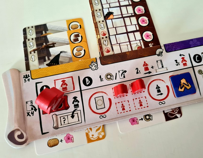 Ces ingrédients font d’Iki un très bon jeu mais je dois dire que j’ai été encore plus séduite par l’interaction pensée par Koota Yamada, qui m’a rappelé l’un de mes jeux préférés, à savoir Brass, pour son côté « coopétitif ». En effet, dans Iki, les autres joueurs sont vos concurrents commerciaux mais aussi vos clients. Vous avez besoin d’eux pour faire progresser vos personnages car ils ne gagneront d’expérience que si un de vos rivaux les active. Lorsque vous recruterez un travailleur, vous chercherez donc celui qui attirera le plus les autres en fonction de la tournure de leur stratégie. Cela implique de bien observer le jeu de chacun et promet de beaux moments autour de la table : « mais si, viens chez moi, ils sont bons mes sushis et t’apporteront la ressource de riz qui te manque pour finir le printemps en beauté ! ». Attention, cependant, car vos adversaires sauront parfois vous faire payer le service que vous leur rendez en faisant partir l’un de vos personnages à la retraite au plus mauvais moment. D’autre part, comme je l’ai dit plus haut, vous aurez parfois besoin des autres pour vous protéger d’un incendie mais les plus retors feront en sorte de libérer la place au dernier moment pour vous exposer directement à la fournaise.