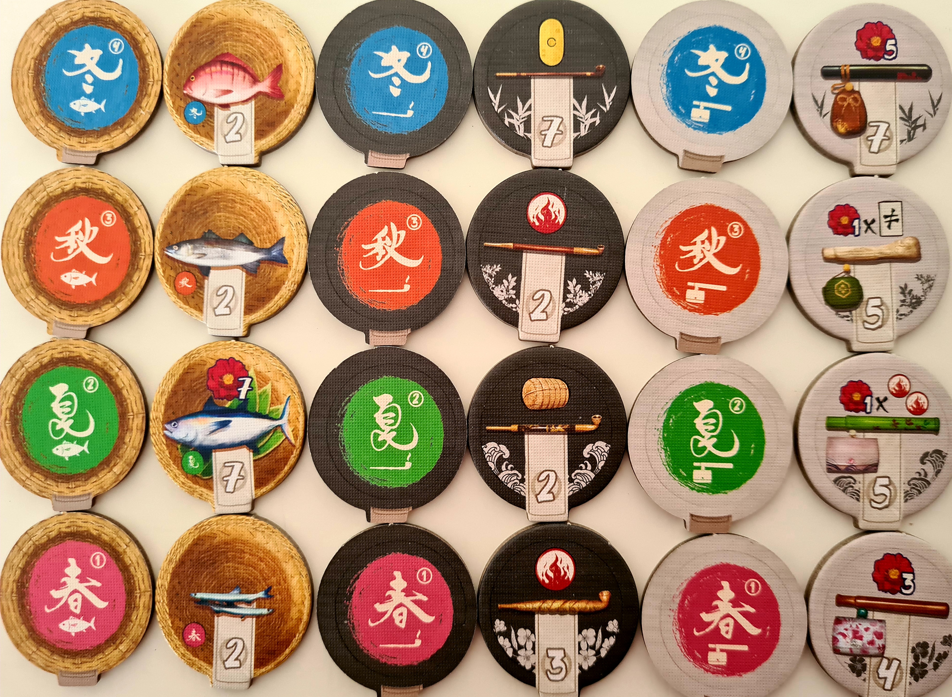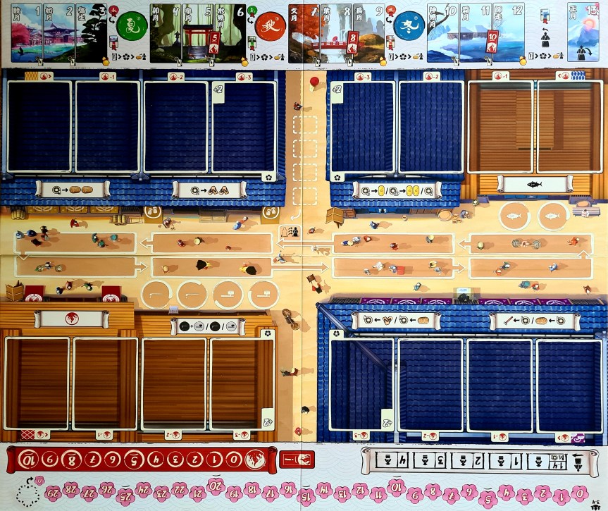 D’autre part, la saisonnalité est justement l’un des ingrédients de la réussite thématique d’Iki. Ce n’est pas un tableau figé d’Edo que vous observerez mais un monde en mouvement et on se laisse d’autant plus convaincre par l’histoire du jeu que la partie s’appuie sur le temps qui passe et les événements qui peuvent venir contrarier le cours tranquille de l’année. Ainsi, les différentes manches représentent les douze mois ; une treizième est prévue, avec des règles spéciales, pour fêter le Nouvel An qui a une importance particulière au Japon. Or, tout évolue à la fin des saisons : les personnages disponibles non recrutés s’en vont, les produits de l’échoppe de tabac se renouvellent, les poissons sont remplacés. L’année qui s’écoule devient d’ailleurs dans le jeu la métaphore de la vie puisque vos artisans et commerçants gagneront en expérience avant de partir à la retraite après avoir assez travaillé. Le propos du jeu relaie efficacement la mécanique. Enfin, ajoutons qu’Iki fait aussi preuve de réalisme historique avec le déclenchement d’incendies, trois fois dans la partie, de manière aléatoire sur le plateau, puisque l’ancienne Tokyo a été ravagée par les incendies pas moins de 49 fois pendant l’ère Edo !