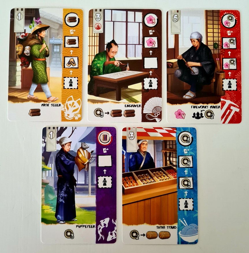 Notons que le reste de la boîte fait l’objet d’une illustration tout aussi plaisante. Les tranches sont historiées avec des vues d’Edo au fil des saisons : en tournant la boîte, vous verrez la ville se transformer et dévoiler différents espaces. Le fond, lui, s’orne d’une reprise de l’illustration du plateau qui consiste en une vue de la grande rue du dessus. Cette dernière est discrète de manière à ne pas prendre le pas sur les informations importantes du jeu : les Nagayas, ces ensembles d’échoppes, sont matérialisés par les toits bleus ou des lattes de bois. La rue est pourtant animée grâce aux petites silhouettes et qui figurent bien les marchands que l’on recrutera par le biais des cartes. Celles-ci ravissent l’œil en nous montrant les travailleurs affairés à leur activité, sur un fond sobre (toujours le même pour un type de personnages) et en mettant en valeur leur accessoire emblématique. Enfin, le style graphique se déploie également sur les cartes bâtiments, assez simples là encore mais élégantes.