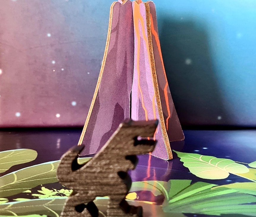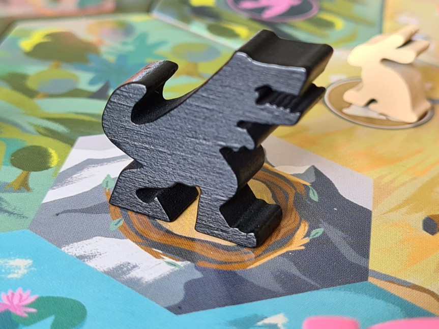 Ouvrir la boîte permet de mesurer d’un seul coup d’œil toutes les ressources fournies par le jeu : un thermoformage accueille des pions en bois, un plateau central et de nombreuses tuiles en carton qui serviront à créer votre monde. L’ensemble est de qualité et bien pensé ; le plateau est par exemple de taille réduite, juste adapté à ce qu’il doit recevoir, afin de ne pas encombrer l’espace de jeu qui sera surtout occupé par les territoires que vous assemblerez. Les tuiles sont solides et distinguées par une constellation et une lettre différente sur leur verso afin de faciliter la mise en place. Des petits éléments viennent rajouter du charme au jeu : des tuiles nid pour accueillir nos petits œufs de dinosaures ou encore un marqueur joueur actif en forme de volcan qui constitue un clin d’œil à notre histoire préhistorique. Néanmoins, l’œil est immédiatement attiré par les meeples animaux qui constituent la plus grande réussite de cette édition : le jeu contient 160 pions en bois de couleur vive découpés pour représenter des silhouettes de rats, de lapins ou de tigres. Ils sont tout simplement adorables et on a très vite une seule envie, jouer pour manipuler toutes ces petites bestioles ! Le matériel contribue indéniablement ici au plaisir ludique car on se plaît aussi à voir notre planète se peupler petit à petit de ces différentes créatures. En noir, le T. rex se distingue immédiatement d’autant que sa taille est supérieure aux autres meeples.