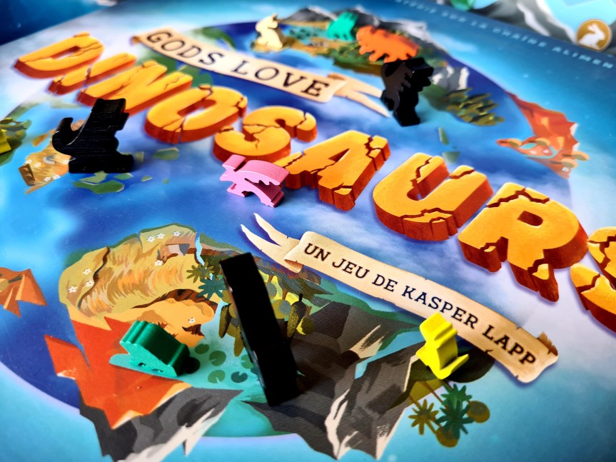 Au commencement, les dieux créèrent leur planète. Ils levèrent les ténèbres et appelèrent la lumière. Puis, ils firent le ciel, le continent et la mer. Ils recouvrirent la terre de verdure, semèrent pour créer des champs, firent jaillir des arbres. Ils aménagèrent des lacs et des montagnes et virent que cela était bon. Les dieux firent tout cela en un jour – il faut dire qu’ils avaient eu une première expérience, riche en enseignements. Le deuxième jour, les dieux dirent : Que les eaux grouillent de grenouilles croassant, que des lièvres au pas léger bondissent dans les blés, que des rats rampent dans les racines dans les forêts, et il en fut ainsi. Le troisième jour, les dieux dirent : Que des tigres aux crocs et aux griffes acérés se tapissent dans les hautes herbes et que des aigles véloces volent au-dessus du monde, et il en fut ainsi. Les dieux bénirent tous les êtres vivants et dirent : Soyez féconds, multipliez-vous et… faites-vous bouffer ! Car les dieux, le quatrième jour, créèrent le tyrannosaurus rex, une créature pour dominer toutes les autres, qu’il fallait bien nourrir. Les dieux virent ce qu’ils avaient fait : cela était très bon. Bienvenue dans le monde de Gods Love Dinosaurs, créé par Kasper Lapp, l’auteur de Magic Maze ! Arrivé sur nos étals en décembre dernier, le jeu, initialement produit par Pandasaurus Games, est localisé par Catch Up et marque le début d’un partenariat plus étroit entre les lyonnais et l’éditeur américain qui assurait déjà la traduction et la distribution de Wild Space et The Loop à l’étranger. Les deux collaborateurs se rejoignent dans leur envie de se démarquer par des choix éditoriaux forts, que ce soit en termes d’illustrations mais aussi de thématiques parfois loufoques, à l’instar de celle de Gods Love Dinosaur dans lequel on incarne des divinités qui construisent un écosystème complet dans le seul et unique but de faire prospérer les dinosaures auxquels elles sont accrocs ! Approchons de plus près les bêtes pour voir ce qu’elles ont dans le ventre…