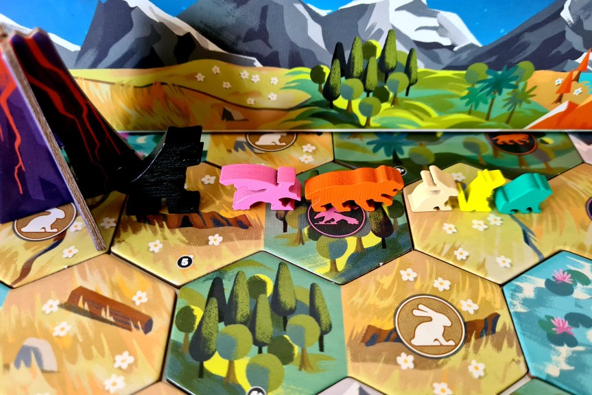 Or, cette simplicité cache en fait une belle profondeur stratégique puisque pour que votre écosystème fonctionne, il vous faudra bien planifier vos actions car chaque choix et placement de tuiles aura un impact sur la suite de votre partie. Effectivement, si vous pouvez théoriquement placer les tuiles de manière totalement aléatoire, vous essaierez plutôt de créer des zones de milieux identiques puisqu’une proie se reproduit uniquement dans le terrain qui lui convient et de manière adjacente. Une trop petite aire de forêts limitera par conséquent le développement des rats. Ensuite, pour nourrir vos prédateurs, il faut que ceux-ci se situent à portée de leurs proies sans quoi ils seront condamnés à périr. Enfin, les dinosaures cherchent à manger des prédateurs mais doivent aussi finir systématiquement leur déplacement sur une montagne, ce qui oblige à en placer à des endroits soigneusement sélectionnés.
