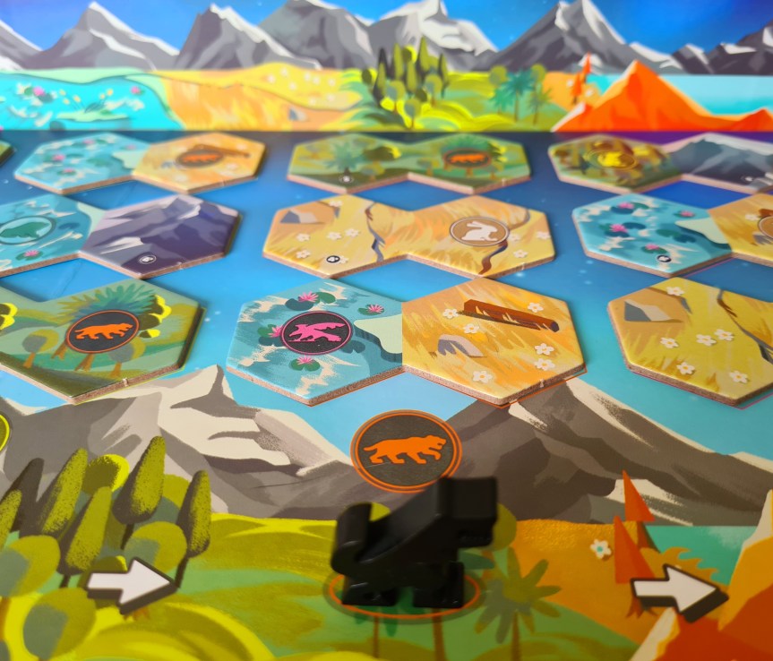 Par ailleurs, la maîtrise des règles est facilitée par l’iconographie présente sur le matériel du jeu qui rend tout assez intuitif. Les illustrations de Gica Tam restent sobres pour ne pas empiéter sur les informations utiles au gameplay et elles viennent même parfois les accompagner comme sur le plateau central qui présente une fresque des différents environnements ; chaque milieu se situe alors au niveau d’un symbole animal ce qui rappelle les habitats préférés des proies. Le système d’activation des créatures apparaît en outre assez évident grâce à lecture tabulaire du plateau. Finalement, à l’issue de la lecture des règles, tout semble évident et on entre aisément dans la première partie.